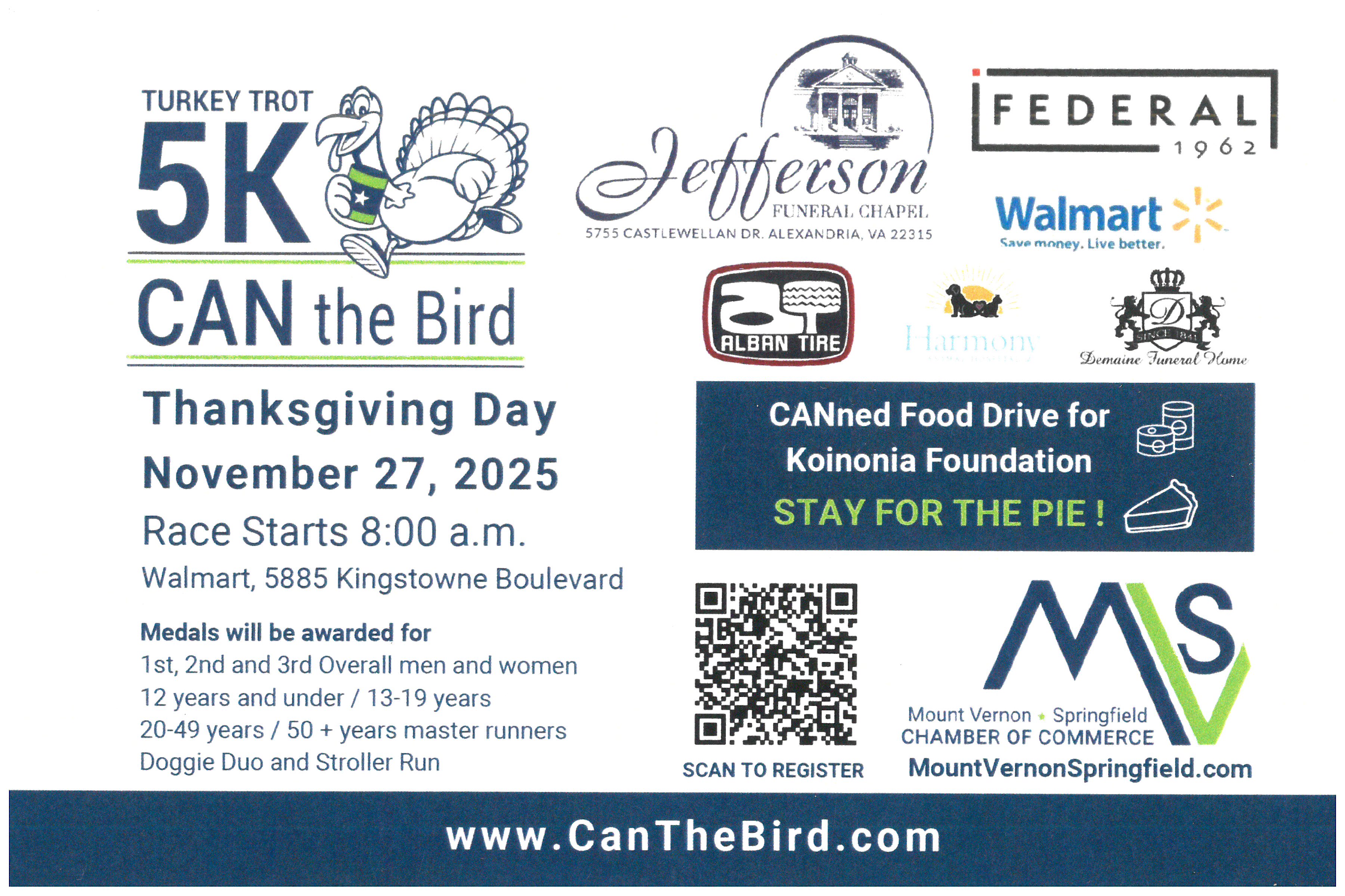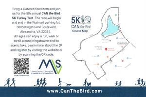 Bring a CANned food item and join us for the 4th annual CAN the Bird 5K Turkey Trot, presented by Jefferson Funeral Chapel, on Thanksgiving Day, Thursday, November 27, 8:00 – 9:00 am. The race will begin and end in the Walmart parking lot, 5885 Kingstowne Boulevard, Alexandria, VA 22315.